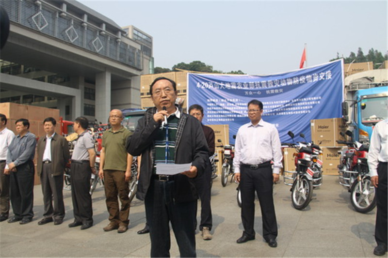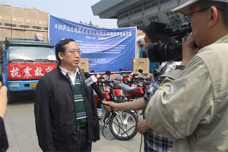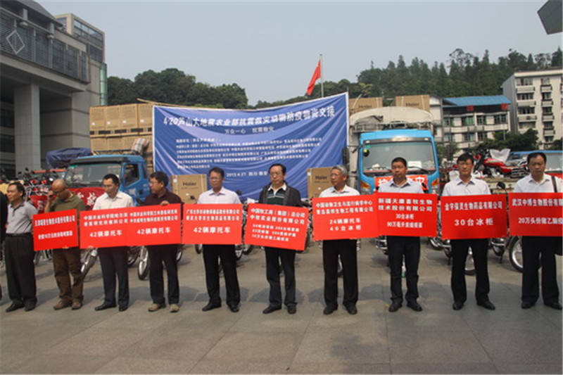 4月27日,农业部在雅安举办抗震救灾动物防疫物资交接,农业部、中国兽医药品监察所、四川省畜牧食品局、中国兽药协会相关领导、参加抗震救灾动物防疫物资捐赠的企业代表到场并将捐赠物资当场移交给灾区人民。威廉希尔中文网站集团董事长张春新代表捐赠企业发言,并接受中央电视台和《农民日报》记者现场采访。